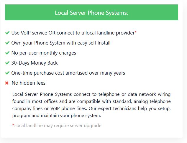 Local Server Phone Systems connect to telephone or data network wiring found in most offices and are compatible with standard, analog telephone company lines or VoIP phone lines. Our expert technicians help you setup, program and maintain your phone system.