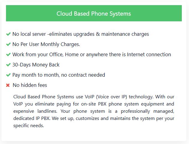 Cloud Based Phone Systems use VoIP (Voice over IP) technology. With our VoIP you eliminate paying for on-site PBX phone system equipment and expensive landlines. Your phone system is a professionally managed, dedicated IP PBX. We set up, customizes and maintains the system per your specific needs.