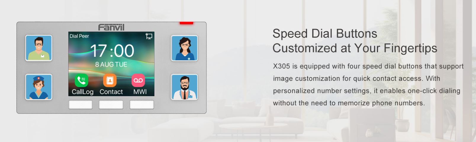 X305 is equipped with four speed dial buttons that support image customization for quick contact access.