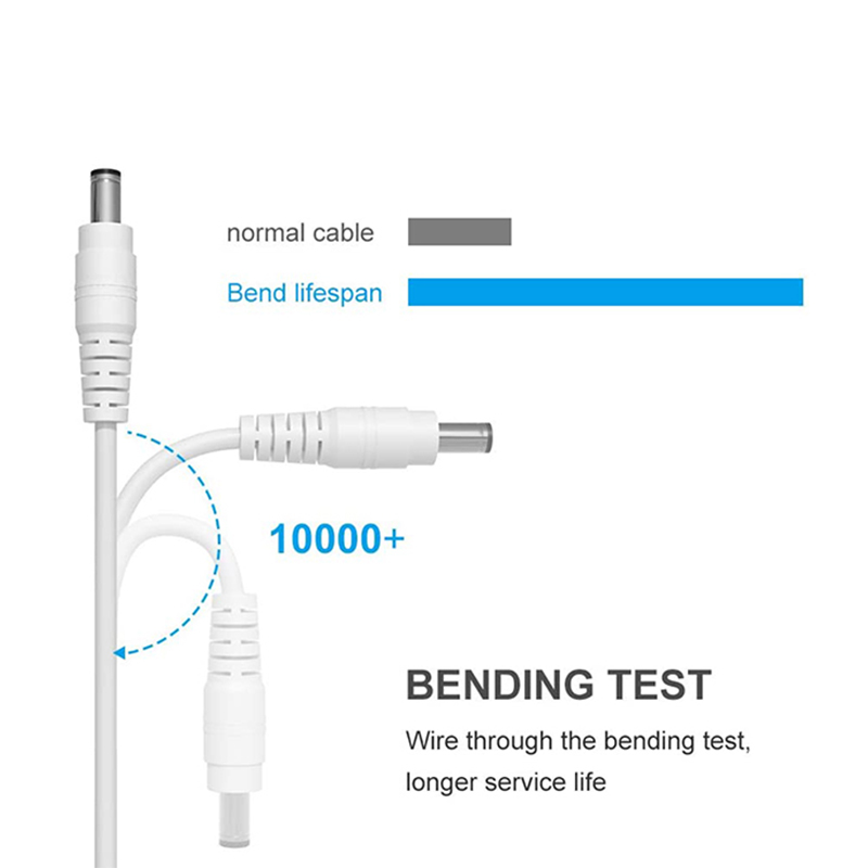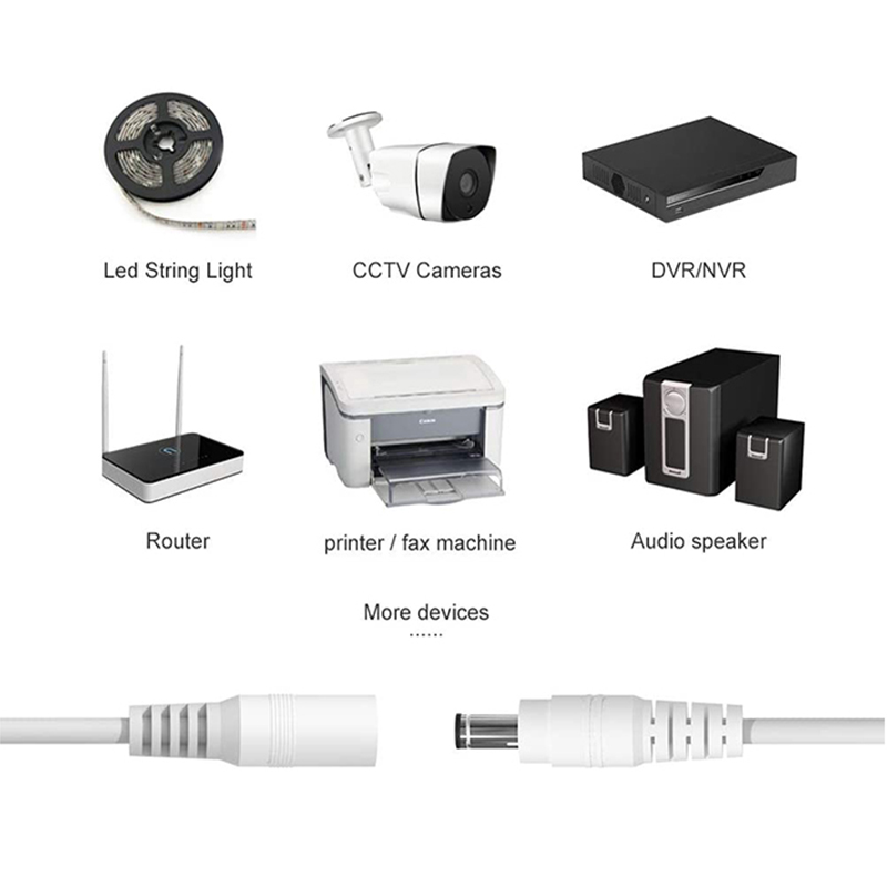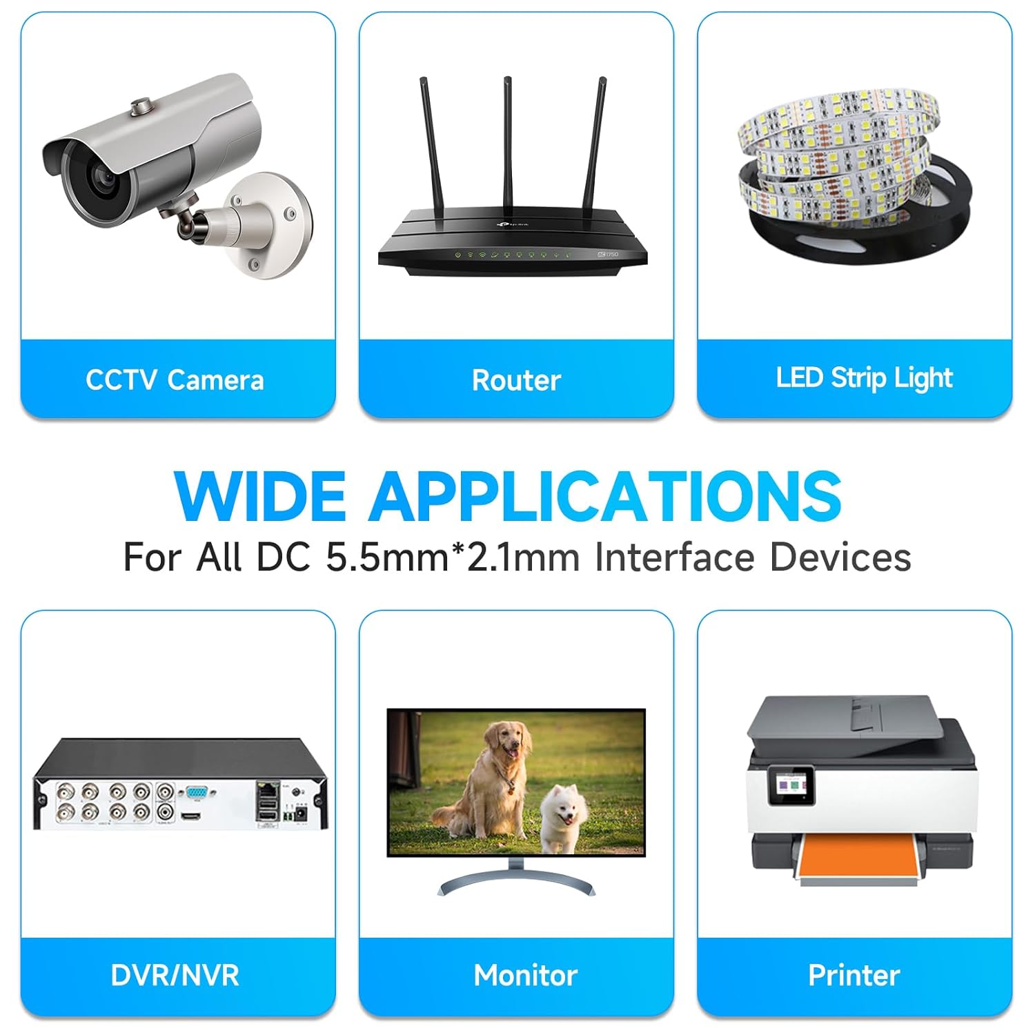 - [Wide Application]—Ideal for CCTV Security Camera, IP camera, LED light strip, Monitor, Printer, Lighting, Router, Recording Equipment, etc. Fit for 12V DC power adapter or other devices requiring 12V DC power or lower DC equipment with DC 5.5mm x 2.1mm plug.