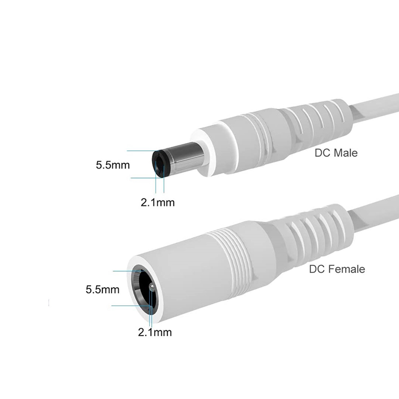 - Male-to-Female DC Extension Cable]—DC 12V 5.5mm x 2.1mm Power Extension Cable, Male to Female Connector. It is a perfect solution when your devices’ standard power cable is too short and need to extend to the installation spot. 2 or more extension cables can be cascaded together to meet longer distance. (Notice: For DC 5.5mm x 2.1mm plug only, it can not work with other size.)